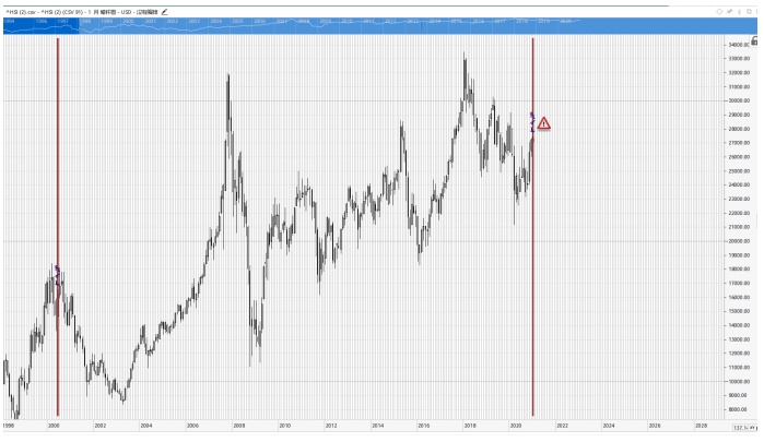 在恒指的月线图,及道指的月线图在2020年12月经历了一个重要的周期。过去出现这周期多是一个中长期的顶部。但过去多次会在高位振荡后再下跌,那读者必须留意未来数月至到四月的时间,股市或者会经历一个回调。而本月留意1月20日-23日及2月4日附近的日子。