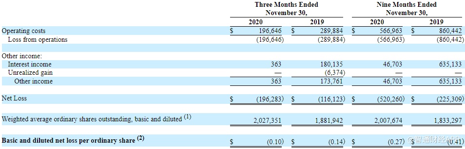 智通财经APP获悉,特殊目的收购公司(SPAC)朗杰收购(LOAC.US)公布截至2020年11月30日的2020年第三季度业绩。公司Q3净亏损19.63万美元,去年同期为11.61万美元;基本和摊薄每股亏损0.10美元,去年同期为0.14美元。截至2020年11月30日,该公司尚未开始运营。