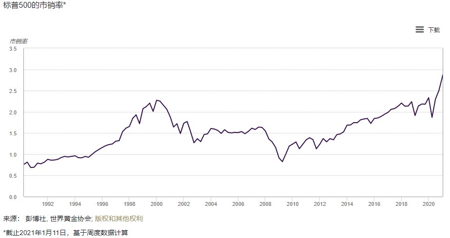 当前的标普500指数的市销率正处于前所未见的极端水平,并且美国对冲基金Crescat Capital近期的分析表明,构成其标准普尔500指数估值模型的15项因子均处于(或非常接近)纪录高位。展望未来,世界黄金协会认为极低的全球利率水平可能会使股价与其估值维持在极端水平。因此投资者可能会经历较强的市场波动及大幅回调。
