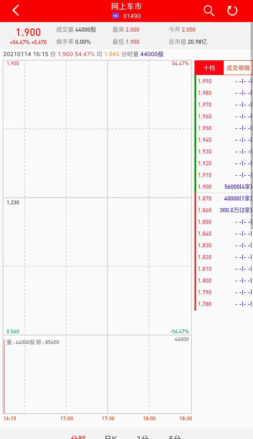 智通财经APP获悉,网上车市(01490)将于1月15日(周五)在香港挂牌,暗盘开盘大涨,截至发稿,利弗莫尔证券资料显示其暗盘报价1.90港元,较招股价1.23港元涨54.47%。每手4000股,不计手续费,每手赚2680港元。