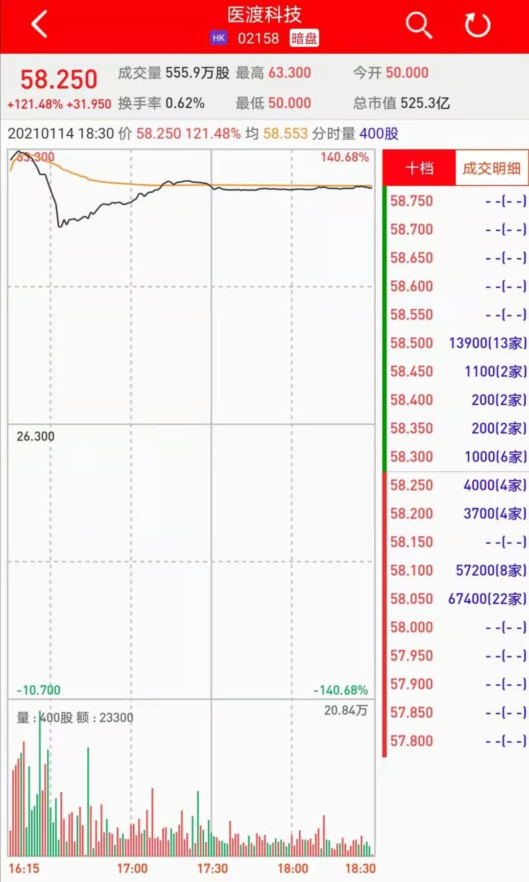 智通财经APP获悉,医渡科技(02158)将于1月15日(周五)在香港挂牌,截至暗盘收盘,利弗莫尔证券资料显示其暗盘报价58.25港元,较招股价26.30港元涨121.48%。每手100股,不计手续费,每手赚3195港元。