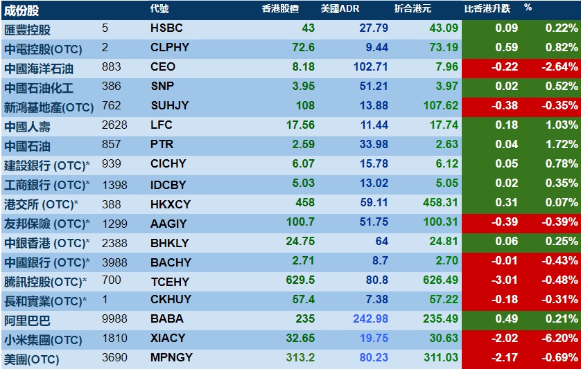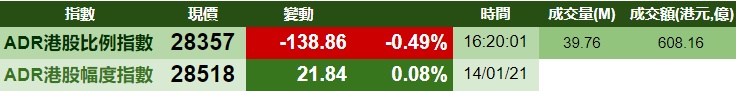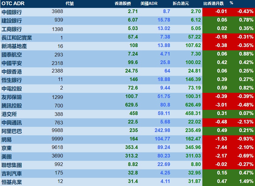 智通财经APP获悉,隔夜美股三大指数齐跌,港股ADR指数全日偏软,按比例计算,收报28357点,跌138.86点或0.49%。