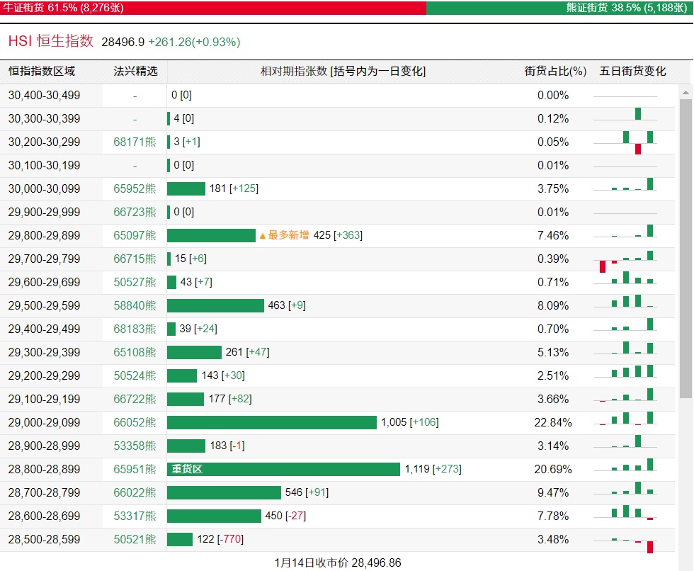 智通财经APP获悉,截至1月15日,恒指最新的牛熊街货比例为61.5:38.5。