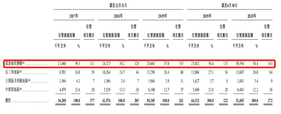 目前,荣万家已基本形成了”两横、两纵、三集群”的服务网络,“两横”指沿着长江及陇海铁路沿线的布局,“两纵”指以京沪、京广铁路沿线的布局,“三集群”是指环渤海经济圈,长三角地区及珠三角地区的城市群。截至2020年上半年,环渤海经济圈的在管面积占总在管面积58.4%,长三角地区、中西部地区、大湾区及周边地区的占比则分别为26%、12.2%、3.4%。