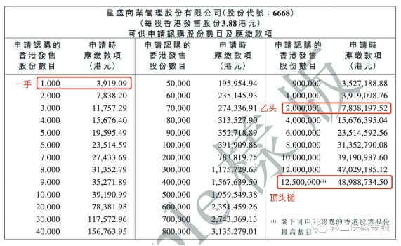打新乙头需要申购200万股2000手,参考上两只股稻草熊(02125)和网上车市(01490)都是30万左右人申购,乙组网上车市2700人,稻草熊乙组2400人,星盛商业按2500人申购乙组算,预计乙头中签10~15手。计息6天,按20倍融资,利率3%算,打和点8.5%左右。