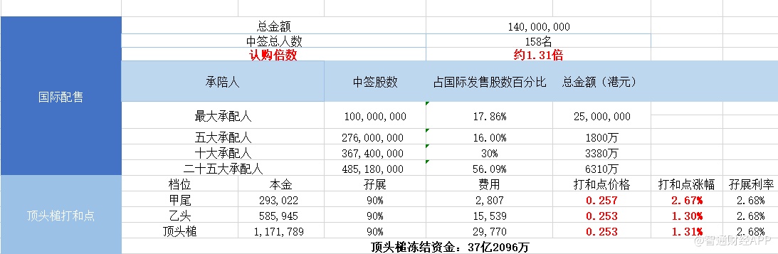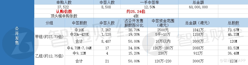 其中,公开配售申购人数37522人,一手中签率12.5%,认购倍数约25.24倍。