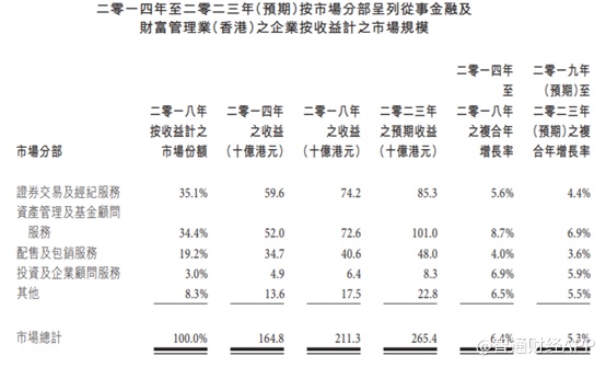其他金融服务中约三分之一来自从事金融及财富管理业公司,2018年市场规模约为2113亿港元。而金融及财富管理的市场规矩较为集中,十大参与者市场份额约35%-40%,参与者超过3000名,竞争十分激烈。