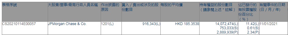 智通财经APP获悉,香港联交所最新资料显示,1月11日,摩根大通减持泰格医药(03347)91.6343万股,每股作价185.3538港元,总金额约为1.70亿港元。减持后最新持股数目约为1407.25万股,最新持股比例为11.42%。