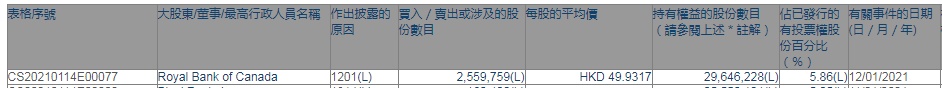 智通财经APP获悉,香港联交所最新资料显示,1月12日,加拿大皇家银行减持福耀玻璃(03606)约为255.98万股,每股作价49.9317港元,总金额约为1.28亿港元。减持后最新持股数目约为2964.62万股,最新持股比例为5.86%。
