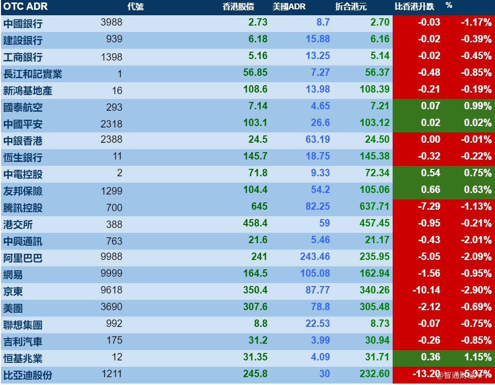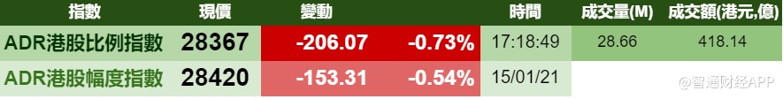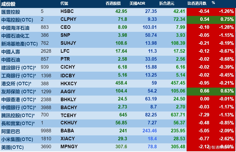 智通财经APP获悉,隔夜美股三大指数齐跌,港股ADR指数下挫,按比例计算,收报28367点,跌206.07点或0.73%。