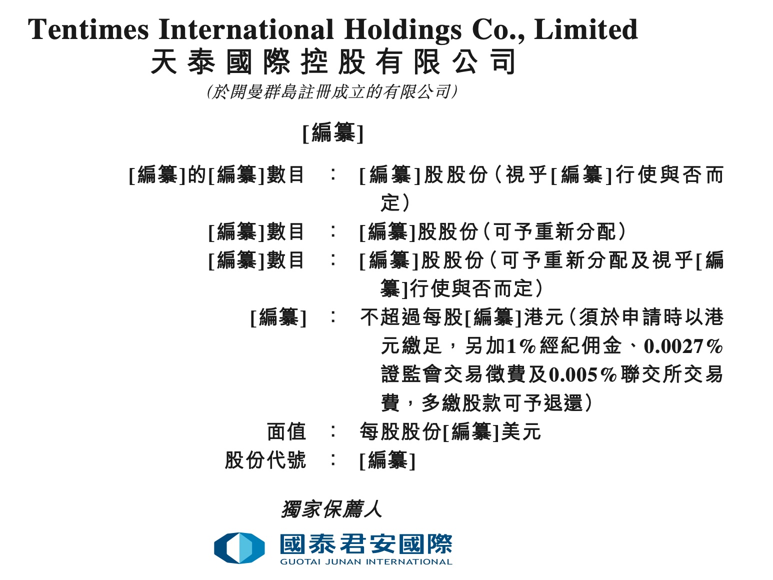智通财经APP获悉,据港交所1月15日披露,天泰国际控股有限公司(下称“天泰国际”)向港交所主板递表,国泰君安国际为独家保荐人。