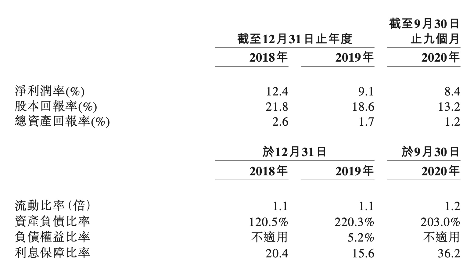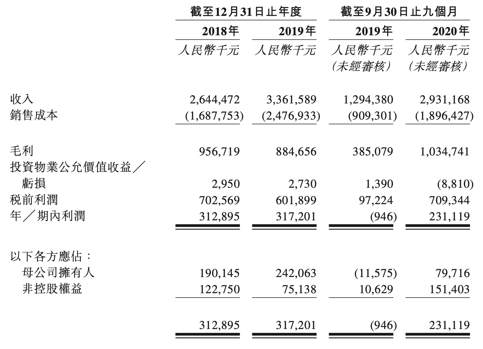 截至2019年12月31日止两个年度及截至2020年9月30日止九个月,公司录得期内净利润约312.9百万元(人民币,下同)、317.2百万元及231.1百万元;来自持续经营的收入分别为26.44亿元、33.62亿元及29.31亿元;毛利率分别为36.2%、26.3%及35.3%。
