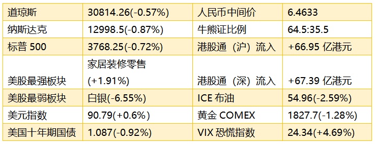1、截上周五美股收盘,标普500指数跌27.3点,跌幅0.72%,报3768.25点;纳斯达克指数跌114.1点,跌幅0.87%,报12998.5点;道琼斯指数跌177.3点,跌幅0.57%,报30814.26点。港股ADR指数下挫,按比例计算,收报28367点,跌206.07点或0.73%。