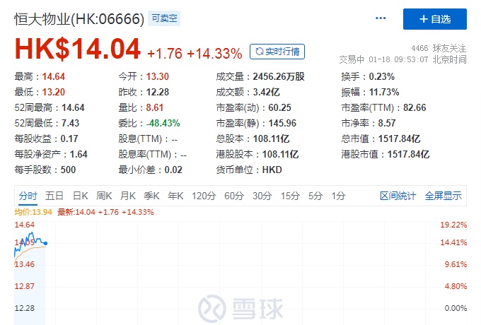 1月18日,恒大物业(06666)大幅高开8.31%,报13.3港元,随后迅速攀至14.64港元,涨幅近两成,股价创历史新高。