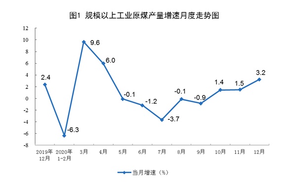 原煤生产有所加快。12月份,生产原煤3.5亿吨,同比增长3.2%,增速比上月加快1.7个百分点;日产1135万吨,环比减少23万吨。2020年,生产原煤38.4亿吨,比上年增长0.9%。