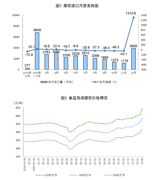 煤炭进口增加。12月份,进口煤炭3908万吨,环比增加2732万吨。2020年,进口煤炭3.04亿吨,比上年增长1.5%。