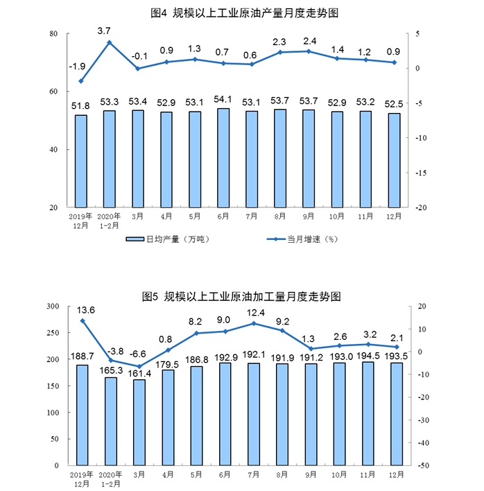 原油生产增速略有放缓。12月份,生产原油1627万吨,同比增长0.9%,增速比上月回落0.3个百分点;日产52.5万吨,环比减少0.7万吨。加工原油6000万吨,同比增长2.1%,比上月回落1.1个百分点。2020年,生产原油1.95亿吨,比上年增长1.6%;加工原油6.7亿吨,增长3.0%。