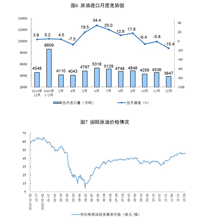 原油进口降幅扩大,国际原油价格继续上涨。进口原油3847万吨,环比减少689万吨,同比下降15.4%,降幅比上月扩大14.6个百分点;2020年,进口原油5.4亿吨,比上年增长7.3%。12月31日,布伦特原油现货离岸价格为51.22美元/桶,比11月30日的46.84美元/桶上涨9.4%。