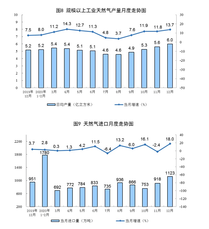 天然气进口由降转增。12月份,进口天然气1123万吨,同比增长18.0%,上月为下降2.4%。2020年,进口天然气1.02亿吨,比上年增长5.3%。