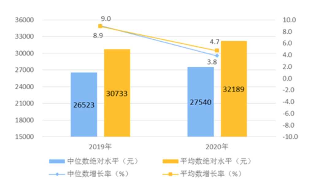 2020年,全国居民人均可支配收入中位数27540元,增长3.8%,中位数是平均数的85.6%。其中,城镇居民人均可支配收入中位数40378元,增长2.9%,是平均数的92.1%;农村居民人均可支配收入中位数15204元,增长5.7%,是平均数的88.7%。