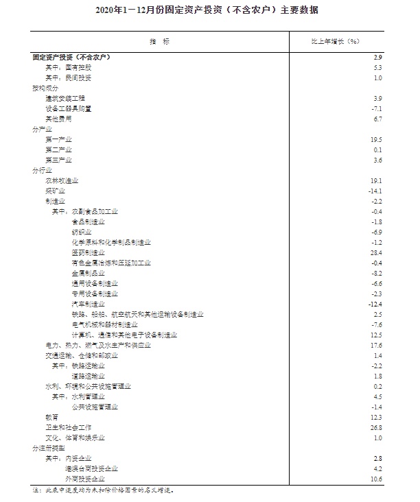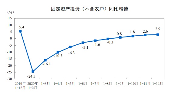 智通财经APP获悉,1月18日,国家统计局公布,2020年1—12月份,全国固定资产投资(不含农户)518907亿元,比上年增长2.9%,增速比1—11月份提高0.3个百分点。其中,民间固定资产投资289264亿元,增长1.0%,增速提高0.8个百分点。从环比速度看,12月份固定资产投资(不含农户)增长2.32%。