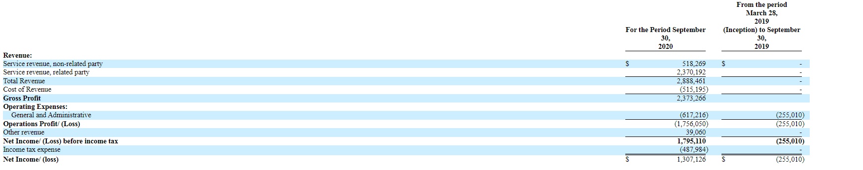 招股书显示,截至2020年9月30日,公司总营收为288.85万美元;毛利为237.33万美元;净利润为130.71万美元,从2019年3月28日至9月30日录得净亏损25.5万美元。