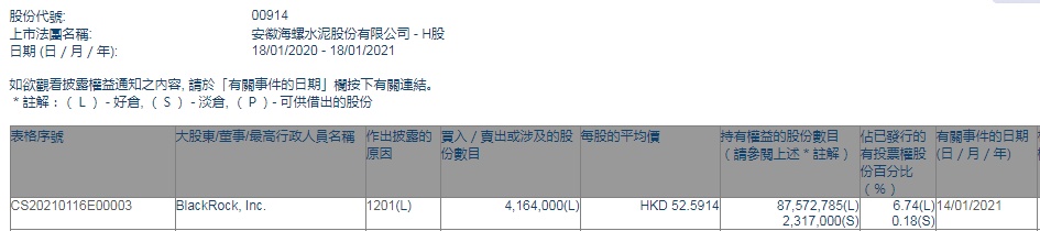 智通财经APP获悉,香港联交所最新资料显示,1月14日,贝莱德减持海螺水泥(00914)416.4万股,每股作价52.5914港元,总金额约为2.19亿港元。减持后最新持股数目约为8757.3万股,最新持股比例为6.74%。