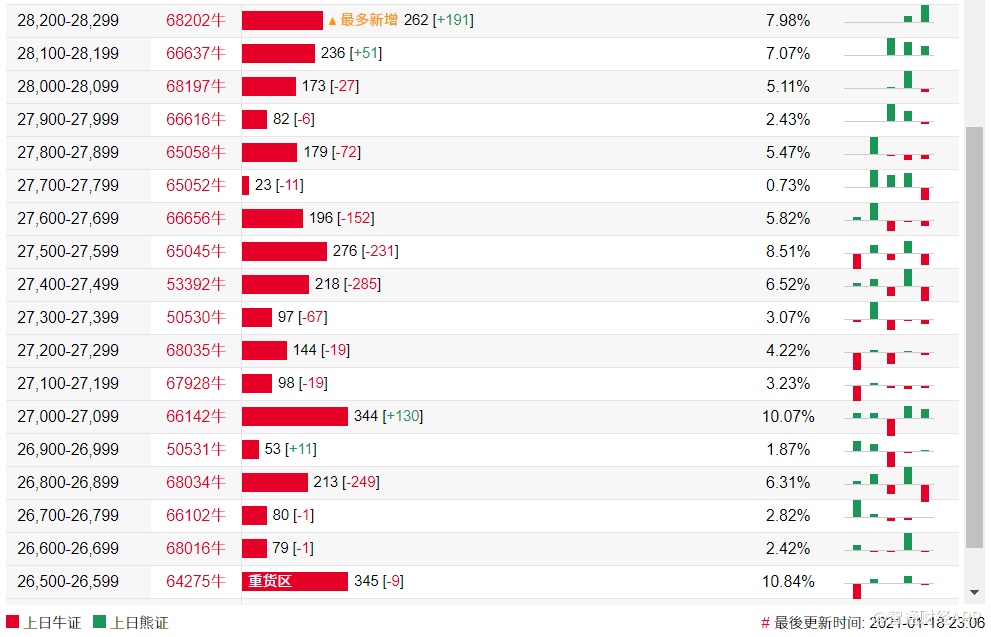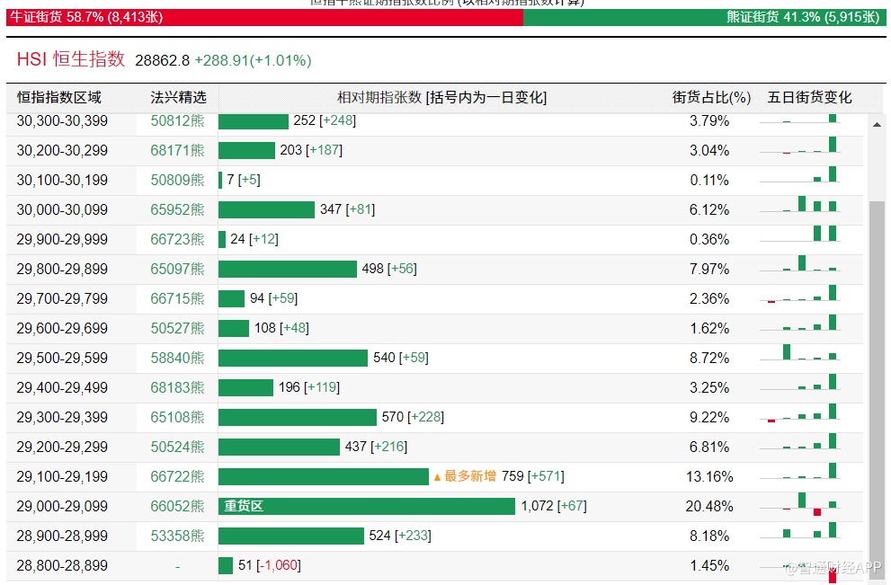 法兴恒指牛熊证街货分布图中的数据显示,熊证街货重货区在29000-29099区间,该区间最新熊证数量为1072张,较上一交易日增加67张;最多新增在29100-29199区间,该区间最新熊证数量为759张,较上一交易日增加571张。牛证街货重货区在26500-26599区间,该区间最新牛证数量为345张,较上一交易日减少9张。最多新增在28200-28299区间,该区间最新牛证数量为262张,较上一交易日增加191张。