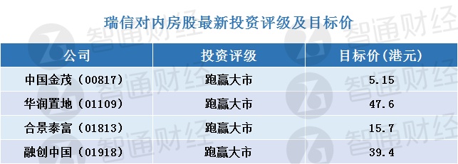 智通财经APP获悉,瑞信发布研究报告,认为市场情绪低迷加上预期较低,开发商在今年首季加强推售新项目将成为主要的催化剂,首选华润置地(01109),在南向资金大量流入的情况下,看好中国金茂(00817)、合景泰富(01813)及融创中国(01918)。