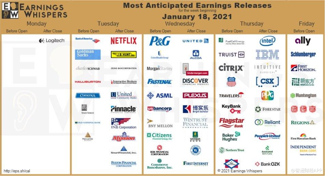 智通财经APP获悉,本周,标普500指数成分股中有43家公司将公布去年第四季度财报,包括美国银行(BAC.US)、Netflix(NFLX.US)、高盛(GS.US)、阿斯麦(ASML.US)、IBM Corp(IBM.US) 和英特尔(INTC.US)等。市场普遍预期,标普500指数成分股的第四季度每股收益同比下滑11%。