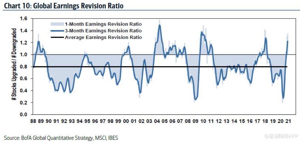 根据美国银行的数据,12月全球盈利修正比例(Global Earnings Revision Ratio)从1.30升至1.35,达到两年高点。持续宽松的货币和财政政策以及多种疫苗开始在全球分发,支持了盈利预期的恢复。过去,当这一比率接近当前水平时,摩根士丹利资本国际全球指数(MSCI All Country World Index)在随后12个月的平均水平为11.3%。美国银行表示,“不断上升的全球宽松浪潮表明,持续的盈利复苏可能会支撑股市的下一轮反弹。”