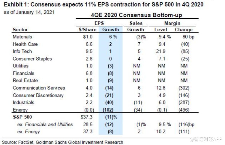 在实际的量化预期方面,高盛分析师David Kostin在报告中表示,市场普遍预期,由于公共卫生事件阻碍了周期性行业的增长,标普500指数成分股的第四季度每股收益同比下滑11%。若排除能源股,标普500指数成分股的每股收益预计将同比下降8%。