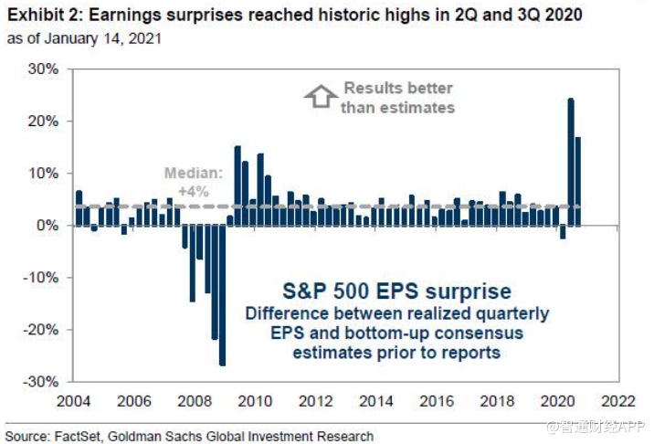 宽松政策仍是推动企业利润增长的关键因素。考虑到美国财政支出增加的可能性,高盛调高了2021年美国实际GDP增长的预测。他们还将2021年标普500指数成分股的每股收益增长率提高了2个pp,至+31%(178美元)。但与此同时,他们将2022年每股收益增长率下调2个pp至10%(196美元),以反映更大的财政支出的积极影响,以及更高企业税的不利影响。