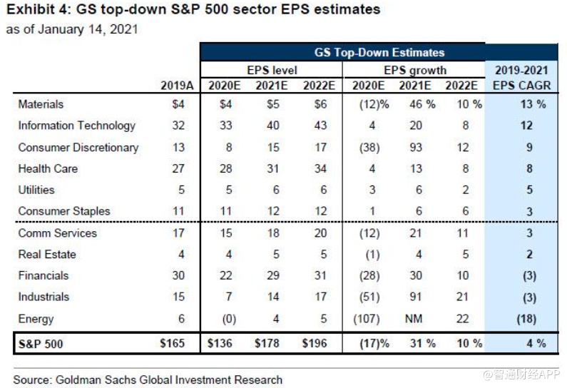 行业层面,高盛预计,到2021年底,11个行业中有8个的每股收益将超过2019年。随着疫苗的推广,该行预计,运营杠杆程度最高的行业,如非必需消费品和能源行业,今年将实现最快的每股收益增长。