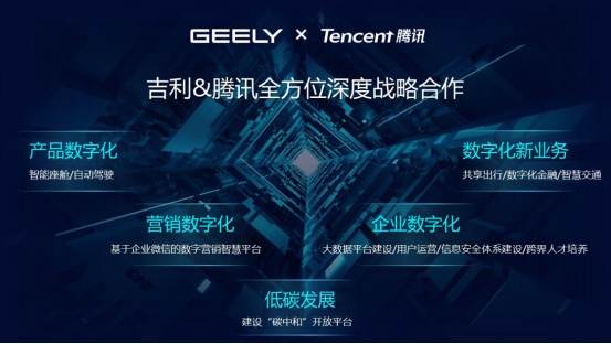 强强联手,腾讯将助力吉利完成“用户全生命周期”数字化升级,打通产品研发、制造、营销、用车、用户运营、售后服务等全产业链数字化闭环,构建“以人为中心”的数字化服务体系。