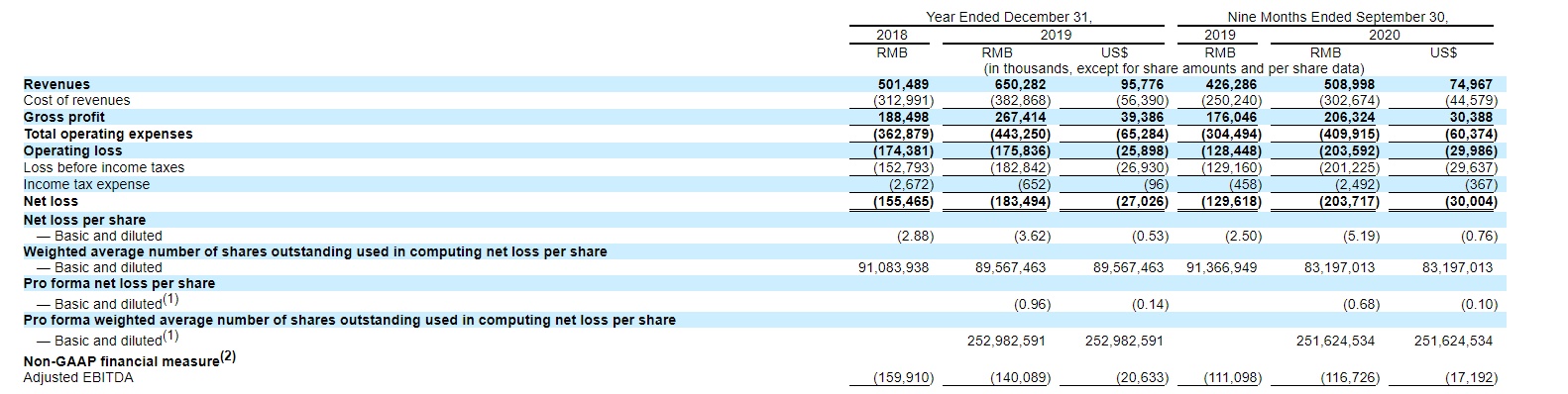 招股书显示,2019年公司营收为6.50亿元(人民币,下同),同比增长29.7%;净亏损为1.83元,上年同期净亏损为1.55亿元;每股亏损为3.62元,上年同期每股亏损为2.88元。