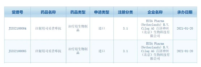 智通财经APP获悉,据国家药监局药品审评中心(CDE)最新公示,EUSA Pharma和百济神州(06160)联合提交了两项IL-6抑制剂注射用司妥昔单抗(siltuximab)的上市申请,并于1月20日获得受理。