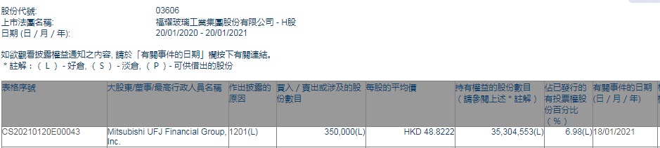 智通财经APP获悉,香港联交所最新资料显示,1月18日,Mitsubishi UFJ Financial Group, Inc.减持福耀玻璃(03606)35万股,每股作价48.8222港元,总金额约为1708.8万港元。减持后最新持股数目约为3530.5万股,最新持股比例为6.98%。