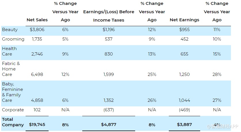 宝洁Q2净销售额为197.45亿美元,同比增长8%。按业务划分,Q2化妆品销售额为38.06亿美元,同比增长6%。洗漱产品销售额为17.35亿美元,同比增长5%。健康保健产品销售额为27.46亿美元,同比增长9%。纺织品及家居护理产品销售额为64.98亿美元,同比增长12%。婴儿、女性及家庭护理产品销售额为48.58亿美元,同比增长6%。