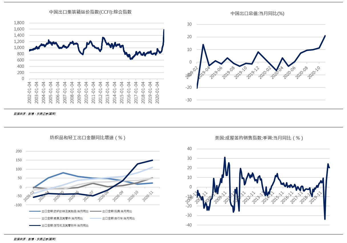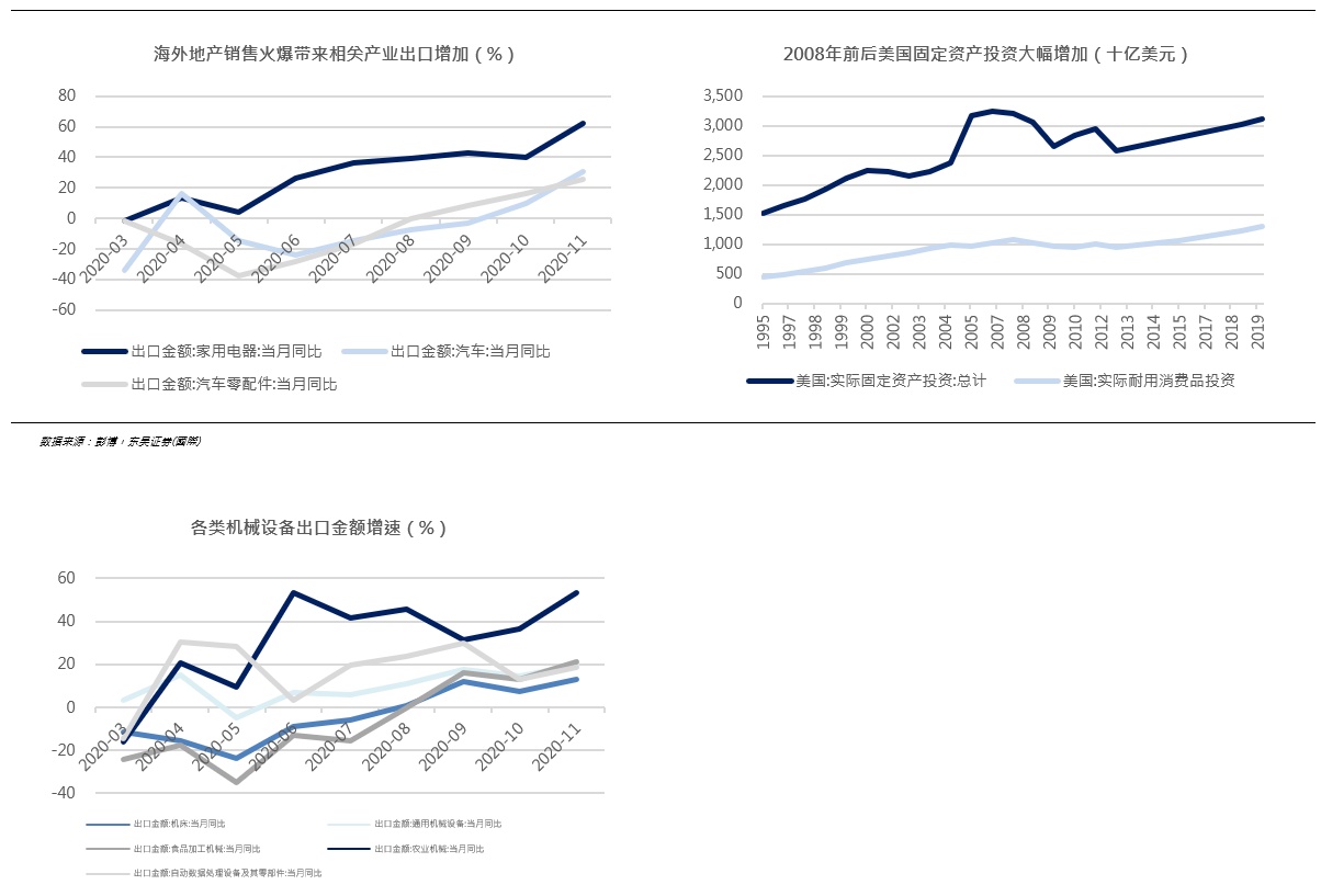 纺织、轻工、家电、汽车及零部件和机械设备等行业出口旺盛。从统计局月度出口数据看,近期出口需求旺盛的行业分为三类,一类是海外公共卫生事件居家隔离产生的相关需求,主要为纺织品和轻工;另外一类则是由于低利率和改善住房导致的北美房地产交易火爆带来的相关需求,主要为家电、汽车及零部件等;第三类是2008年金融危机前后大量固定资产投资带来的更新需求(固定资产约10年折旧完毕),主要为机床、通用机械、农业机械、食品加工机械等机械设备。