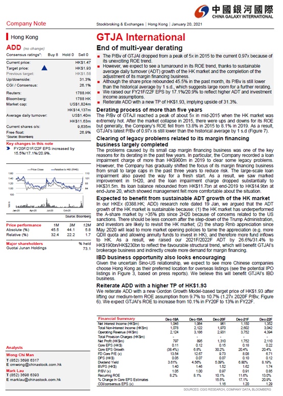 预计将受益于香港市场平均每日成交金额(ADT)的持续增长。在香港交易所(00388)1月19日的研究报告表明,香港市场的ADT增长是可持续的,因为:1)自2020年下半年以来,香港市场的表现比A股市场的差35%。特朗普政府下台后,人们的担忧应该会减少,投资者可能会重新关注香港市场;2)2020年5月以来,人民币的大幅升值将引出更多的市场开放政策(例如更多的QDII额度和允许年金基金投资于香港),从而有更多的资金流入香港。因此,中国银河国际将2021年/2022年的预期ADT上调26.6%/31.4%,至1900亿港元/2300亿港元,以反映有利的结构性趋势,这将有利于国泰君安国际的经纪业务,并间接创造更多的保证金融资需求。
