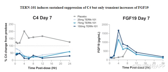 其中,临床进展较快的是FXR激动剂TERN-101,目前正在进行一项名为LIFT研究的2a期临床试验,预计该研究主要数据将在今年下半年获得。前期临床研究展示,TERN-101对肝脏FXR激活生物标志物7α-C4的显著抑制作用,且具有良好的安全性。