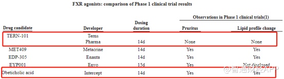 从整体的管线布局来看,目前拓臻生物最核心的候选产品莫过于TERN-101。与OCA类似,TERN-101选定的也是FXR靶点。参考OCA的临床试验数据,其在安全性方面(瘙痒和LDL升高)有着极为明显的缺陷,这也是美国FDA质疑OCA的最大原因之一。
