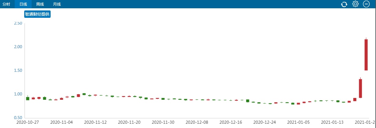 1月18日,股价首现抬头趋势,微涨3.61%。1月19日,股价继续拉升,上涨6.98%。后面两天,股价涨势就彻底放飞——19日暴涨了43.48%,21日则飙涨63.63%,涨势一天比一天凶猛。