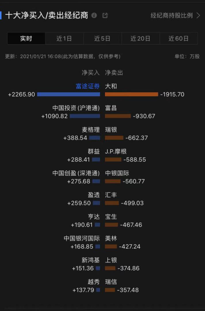 从十大净买入/卖出经纪商最新数据来看,截至1月21日16时08分,富途证券净买入2265.9万股,居十大净买入经纪商之首;中国投资(沪港通)净买入1090.82万股,排名第二;而麦格理、群益、中国创盈(深港股)则分别买入388.54万股、288.41万股275.68万股。