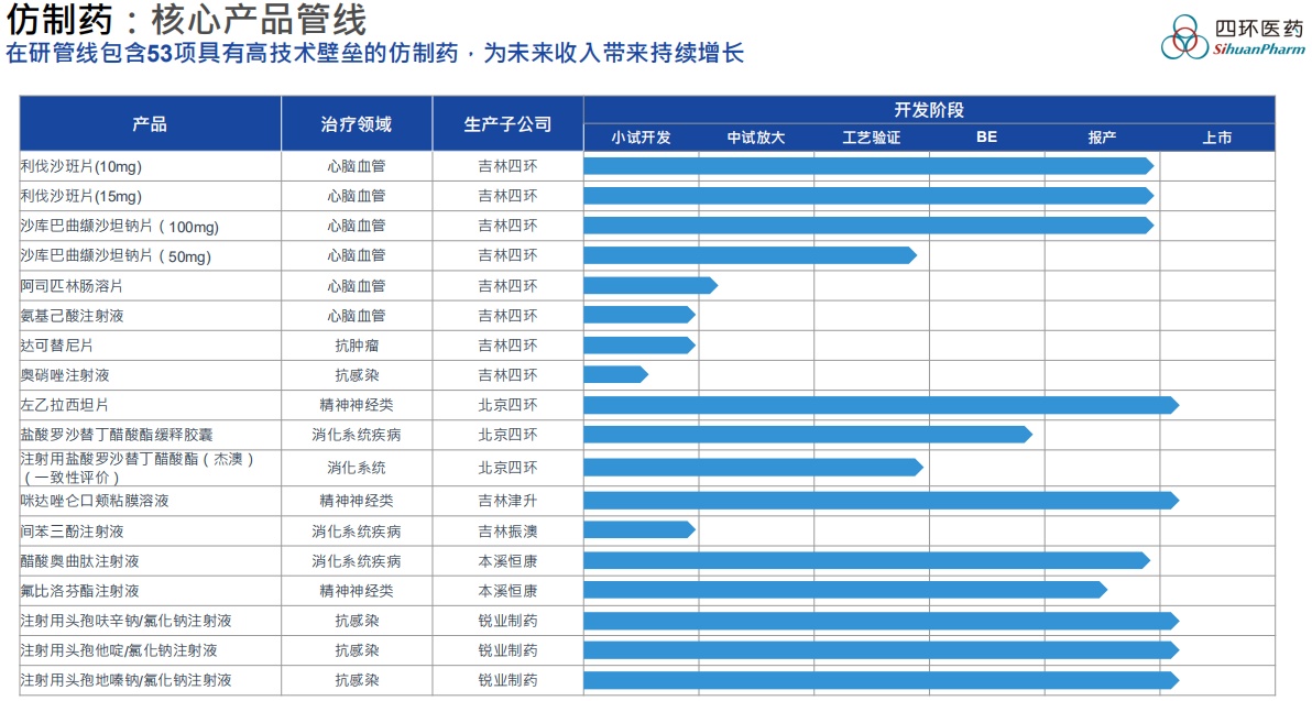 通过不断的开疆扩土,其目前研发领域已经涵盖了心脑血管系统、中枢神经系统、新陈代谢、肿瘤及抗感染这五大重大治疗领域,研发产品管线共计80项,涵盖小分子靶点创新药(14项)、市场潜力巨大的生物药(13项),以及具有高技术壁垒的仿制药(53项)。