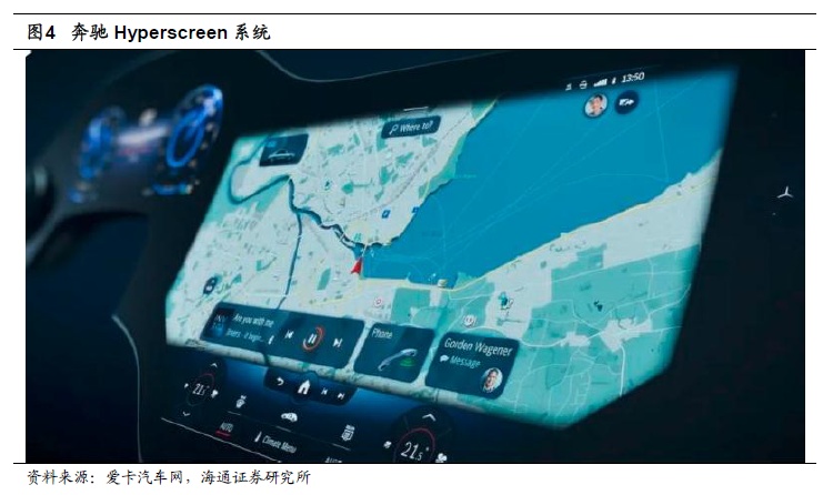 (1)奔驰推出MBUX Hyperscreen,其拥有3 块无缝融合的显示屏,全宽达141cm,该系统拥有非常强大的硬件,包括8 核CPU、24GB 内存和每秒46.4GB的内存带宽。根据规划,该系统将搭载在奔驰纯电动豪华轿车EQS 车型上。