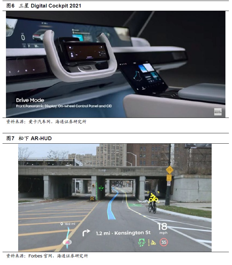(3)三星推出了Digital Cockpit 2021,该产品由三星与哈曼联合开发,其最核心的部分是一块可以升降的49 英寸QLED 大屏幕。