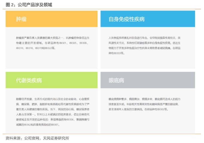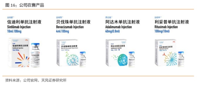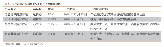 目前公司在售产品集中在肿瘤和自身免疫领域,最近两年成功推出4个产品,分别是信迪利单抗注射液(PD-1)、贝伐珠单抗注射液(VEGFA)、阿达木单抗注射液(TNF-α)、利妥昔单抗注射液(CD20)。