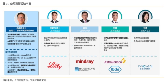 公司管理团队在药企运营及管理领域拥有丰富经验。其中俞德超博士为公司董事长兼首席执行官,历任Calydon副总裁,Cell Genesys首席科学家,康弘生物总裁兼首席执行官,拥有逾20年行业经验,并曾发表50多篇SCI论文及专著;周勤伟博士为公司首席运营官,拥有超过24年行业经验,曾任礼来生物分析科学副总裁;奚浩先生为公司首席财务官,曾任迈瑞医疗国际首席财务官及Biosensors International首席财务官。